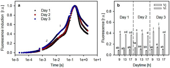 (a) Exemplary fast fluorescence induction kinetics measured ex situ at 13:00 h in samples taken from microalgae cultures during the three-day trial using an Aquapen AP-100 portable fluorimeter. (b) Changes in variables Vj and Vi were calculated from fluorescence induction curves using samples taken from cultures at particular daytimes (at 9:00, 13:00 and 17:00 h) on days 1–3. Values (for more details, see Materials and Methods) are presented as mean (n = 3) ±SD and those designated by the same letter did not differ significantly from each other.