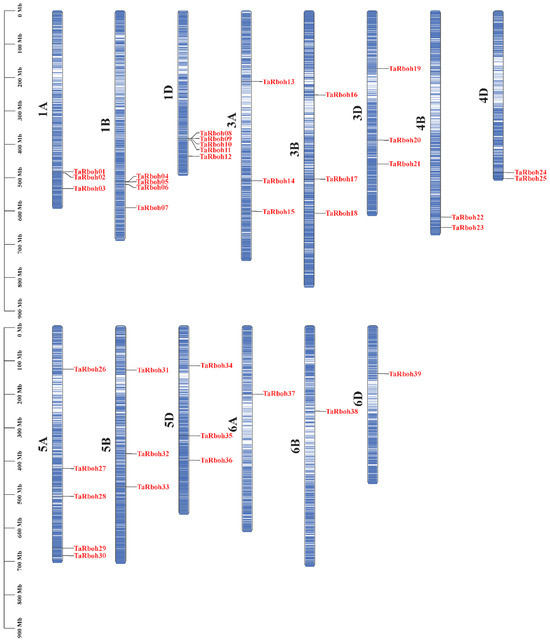 Using HMMER 3.0 software and conserved domain identification, 39 TaRboh genes encoding putative proteins with conserved NADPH_Ox, Ferric_reduct, FAD_binding_8, and NAD_binding_6 structural domains were identified using a Hidden Markov Model (HMM)-based approach combined with SMART structural domain validation. Among them, TraesCS1B02G295200 and TraesCS1D02G284900 contained three and four EF-hand motifs, respectively; twenty-eight Rboh proteins had two EF-hand motifs, eight Rboh proteins had only one EF-hand motif, and one Rboh protein (TraesCS3B02G212900) lacked an EF-hand motif (Table S1). Based on their genomic localization in wheat and widely accepted standard of gene nomenclature, the 39 TaRboh genes were designated TaRboh01 to TaRboh39. The TaRboh genes were unevenly distributed across chromosomes 1A, 1B, 1D, 3A, 3B, 3D, 4B, 4D, 5A, 5B, 5D, 6A, 6B, and 6D. Furthermore, most TaRboh genes were located in the terminal regions of the chromosomes, with few in the central regions (Figure 1). Analysis of the physicochemical properties of TaRboh proteins (Table S2) revealed that the predicted Rboh proteins comprised between 800 (TaRboh02) and 1223 (TaRboh04) amino acids, with molecular weights ranging from 90.83 kDa (TaRboh02) to 139.42 kDa (TaRboh02). Their pIs varied from 8.88 (TaRboh09) to 9.47 (TaRboh18), indicating that most of the TaRboh proteins were basic. For the instability index (II), only six Rboh proteins (TaRboh06-TaRboh07, TaRboh12, TaRboh36-TaRboh38) were predicted to be stable, with instability index values below 40. The GRAVY value was less than zero, suggesting that these proteins were hydrophilic. Moreover, subcellular localization prediction revealed that all of these TaRboh proteins were localized to the cell membrane (Table S2).