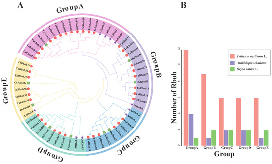 Rboh gene family in wheat, Arabidopsis, and rice. (A) The phylogenetic tree constructed for Rhoh sequences from wheat, Arabidopsis, and rice using MEGA-X based on the neighbor-joining (NJ) method with the p-distance substitution model (gamma = 1) and 1000 bootstrap replicates. The Rboh proteins of wheat are denoted by red circles. The Rboh proteins of rice are denoted by green squares. The Rboh proteins of Arabidopsis are denoted by purple pentagrams. (B) The number of Rboh genes belonging to different groups in wheat, Arabidopsis, and rice, respectively.