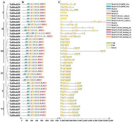 To explore the diversity of TaRboh genes, in silico phylogenetic tree construction, gene structure analysis, and motif identification were performed (Figure 3). The 39 TaRboh genes formed 10 groups based on the analysis using MEGA 11.0 software. Groups VI, VII, and X had the most TaRboh gene members (six each), while the other groups contained two or three TaRboh genes each (Figure 3A). Additionally, the gene structure analysis (Figure 3C) revealed that most of the TaRbohs had untranslated regions (UTRs). The exceptions included TaRboh01, 04, 09, 28, and 36. All but three (TaRboh28, 33, and 36) of these TaRbohs possessed introns. TaRboh04 has the highest number of exons (16), while the numbers of exons possessed by other TaRboh genes varied between 1 and 14. As shown in Figure 3B, different groups of TaRboh genes had different motif compositions, but motifs for these genes within the same group are highly preserved. All except Group II genes had 15 motifs. Those in Group II lacked motif 14. According to domain alignment, the NADPH_Ox domain was made up of motifs 13 and 15, the NAD_binding_6 domain was made up of motifs 3, 5, 8, and 9, the Ferric_reduct domain was made up of motifs 2, 7, and 11, and the FAD_binding_8 domain was made up of motifs 1. In general, TaRbohs with the same types and arrangements of motifs were clustered into the same group. Genes on adjacent branches of the phylogenetic tree with similar numbers and arrangements of motifs and gene structures may have similar biological functions.