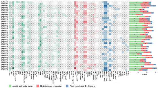 Distribution of cis-elements in the promoter regions of the TaRboh genes. The color and number of grids represent the quantity of cis-elements in each of the TaRboh genes.