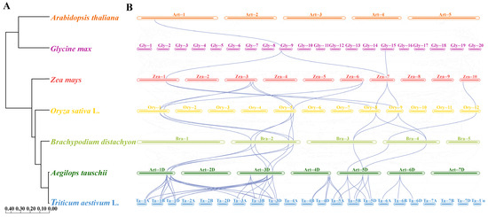 Synteny analysis of TaRboh genes between wheat and six other plant species (maize, rice, Brachypodium, Glycine, Arabidopsis, and Aegilops) based on the species’ evolutionary tree on the left. (A) Evolutionary relationships among the seven species predicted based on their whole genomes. Node numbers represent the estimated divergence times. (B) Collinearity relationships among the seven plant species based on the TaRboh genes in wheat. Gray lines in the background indicate syntenic blocks between adjacent species, while the blue lines highlight the linked genes identified.