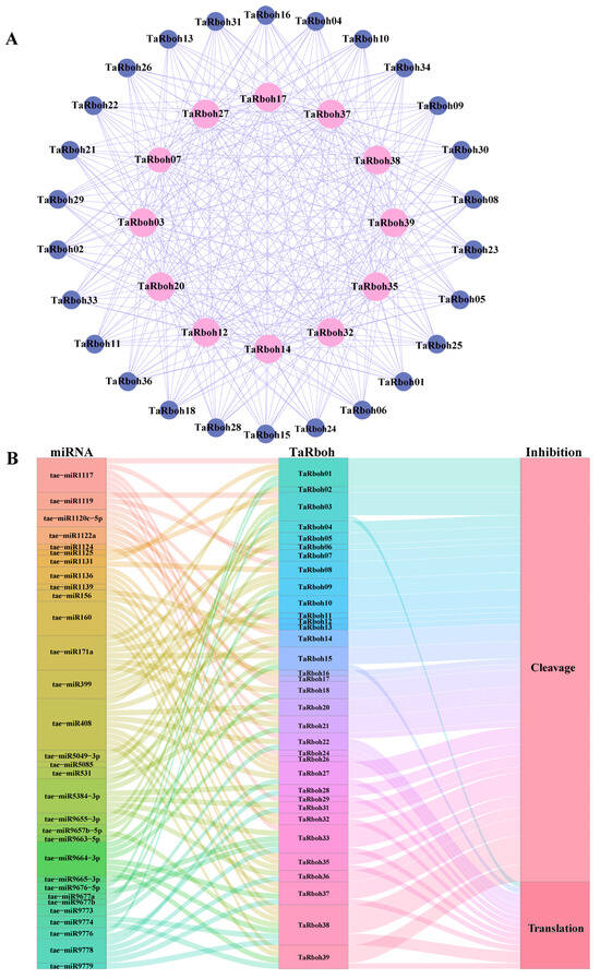 Protein–protein interaction network and miRNA target analysis of TaRbohs. (A) Red represents 13 TaRboh proteins with a high degree of 26. Blue represents 26 TaRboh proteins with a low degree of 12. (B) Sankey diagram depicting relationships of TaRboh transcripts targeted by miRNAs. The three columns represent miRNA, TaRboh, and the inhibition effect. Different colors are used to distinguish different mirnas, different TaRbohs, and different the inhibition effects.