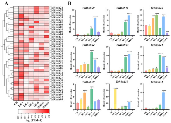 Drought and heat stress are the main factors limiting plant growth and reproduction, and they often occur simultaneously [25]. To further investigate the potential role of TaRboh genes, wheat was grown under a variety of stress conditions, including drought stress for one hour (DS-1), drought stress for six hours (DS-1), heat stress for one hour (HS-1), heat stress for six hours (HS-6), combined heat and drought stress for one hour (DHS-1), and combined drought and heat stress for six hours (DHS-6). An analysis of RNA-seq transcriptomic data was performed to evaluate the expression profiles of the TaRboh genes in various stress conditions using the Wheat Expression Browser (expVIP) (www.wheat-expression.com (accessed on 7 December 2023)). This analysis showed the distinct expression of these genes under different stress scenarios (Figure 8A). Compared to those in the controls, three-quarters of the TaRboh genes had higher expression at DS-1 and lower expression at DS-6. Although the expression of 11 TaRboh genes was not significantly altered at HS-1, substantial upregulation for 12 TaRboh genes was detected at DHS-6. Additionally, during drought stress, expressions of some genes (TaRboh14, TaRboh17, and TaRboh20) did not significantly change. However, the expressions of these genes were significantly increased under heat stress and combined heat and drought stress. TaRboh28, TaRboh33, and TaRboh36 showed no significant change under other conditions, but had significantly increased expression under drought stress.