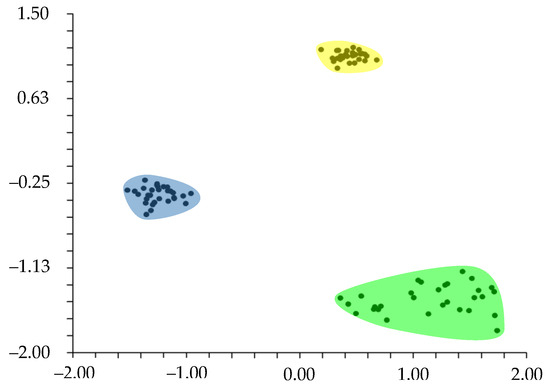 The DA, carried out using the names of the species (three groups: Drymaria diandra, D. villosa, and Drymaria sp.), predicted three clearly separated groups (Figure 3) based on the first two discriminant functions, which explain 100.0% of the total variation [eigenvalues: 79.7% (first function) and 20.3% (second function)]. These groups correspond to D. diandra, D. villosa, and Drymaria sp.