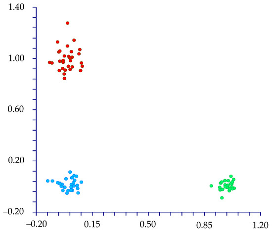 Concerning the hierarchical clustering (Figure 1), the cutoff dissimilarity point (1.35) defines three clusters, with each one comprising specimens referring to single species, i.e., Drymaria diandra, D. villosa, and Drymaria sp.
