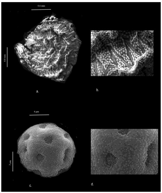 SEM images of Drymaria anilii: (a) seed; (b) magnification of seed surface; (c) pollen grain; (d) magnification of pollen grain.