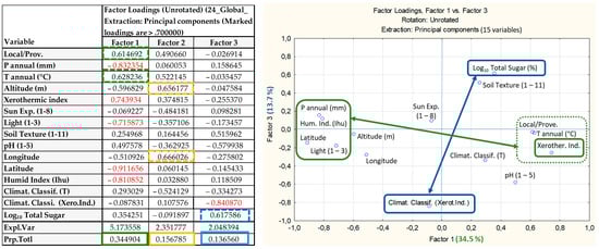 Interaction among the total sugar content (% f.w.), site features (latitude, longitude, altitude), edaphoclimatic characteristics and climatic classifications (Thornthwaite and xerothermic index) by PCA analysis (see left table). Note: The variables are associated with each factor 1–3, according to the coefficients’ factor loadings, presented on the left table (green, yellow and blue for factor 1, 2 & 3, respectively). Moreover, the highest factor loadings (>0.70) are marked in red (on table) as they are relevant to explain the total variance expressed by each factor (1 to 3), as well as correlated among them (direct or inversely/on opposite sides). The figure shows the interaction between factor 1 and factor 3, in green and blue, respectively, as well as the line colors, that show the relationship between the variables associated with the same factor, directly or inversely.