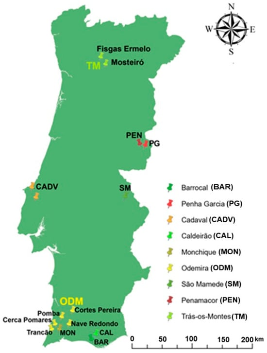 The identification of prospective sites was based on the application of two distinct criteria. The first criterion involved the inclusion of provenances that have a historical and economic tradition of harvesting fruit for brandy production [54]. The second criterion involved provenances representative of the diversity of the species excluding sites that had already been characterized in previous studies [55,56,57,58]. In this way, accessions of cultivated and wild plants (in non-irrigated orchards and natural areas, respectively) were identified by producers for their fruit production and quality, as well as accessions from wild areas where there is no tradition of economic exploitation of the species, but which are of potential interest to small farmers, particularly in mountainous regions, characterized by a higher risk of desertification and forest fires. In these areas, the species can play an important role, providing a new source of income and contributing to population settlement, while increasing biodiversity and conserving the soil. Figure 2 shows the distribution of the different accessions according to the 14 provenances (Table 2).