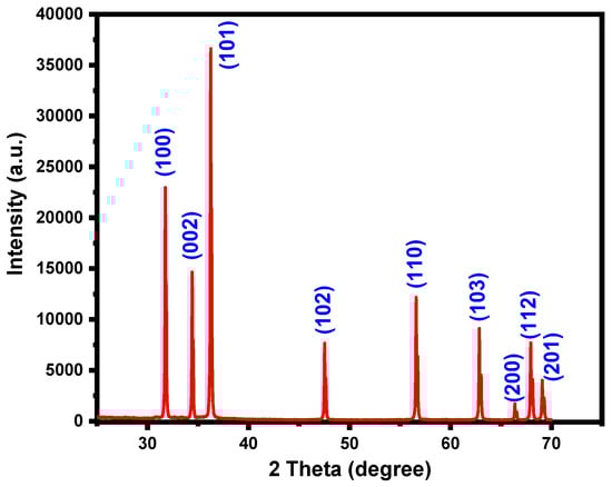 The structural and phase purity of ZnO nanoparticles is illustrated in Figure 1. The XRD diffractogram aligns well with the hexagonal wurtzite structure, as confirmed by comparison with JCPDS card No. 89-1397, showing no evidence of secondary phases or impurity peaks. The strong, narrow diffraction peaks indicate that the product has a high-quality crystalline structure. The sharp, intense diffraction peaks observed at approximately 2θ values of 31.29°, 33.95°, 36.04°, 47.05°, 56.09°, 62.38°, 65.90°, 67.45°, and 68.60° correspond to the crystal planes (1 0 0), (0 0 2), (1 0 1), (1 0 2), (1 1 0), (1 0 3), (2 0 0), (1 1 2), and (2 0 1), respectively.