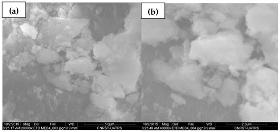 SEM image of synthesized ZnO NPs using thyme, Thymus vulgaris L., leaf extract, (a) ×20,000, (b) ×40,000.