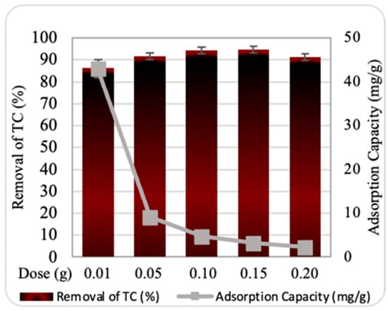 The effect of ZnO NPs dosage on TC adsorption efficiency and capacity was evaluated using a range of 0.10 to 0.20 g, with a starting TC concentration of 10 ppm, a contact time of 30 min, and a temperature of 25 °C. As shown in Figure 4, the maximum TC removal efficiency reached 94% at a ZnO NP dosage of 0.10 g. However, at higher ZnO NP dosages, the removal efficiency remained nearly constant or slightly decreased. This may be attributed to the nanosorbent’s large surface area, which provides ample adsorption sites even at lower dosages.