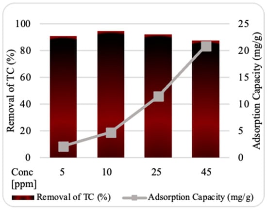 The effects of the initial amount of TC on the removal percentage by ZnO NPs were investigated at 5, 10, 25, and 45 ppm of TC, as shown in Figure 5. The maximum adsorption efficiency during the batch experiment duration was obtained with a starting TC concentration of 10 ppm. The results indicate that adsorption at low concentrations may be highly driven by the combination of the high concentration of the adsorbate at the initial stage and the large number of readily available adsorption sites. As the TC molecules start competing for the remaining sites and the adsorbed ZnO NPs begin to generate repulsive interactions during further adsorption, the number of available sites may gradually decrease [16], causing low adsorption efficiency. In contrast, the adsorptive capacity of the prepared nanosorbent was found to increase dramatically as the TC concentration increased, suggesting the good adsorptive ability of ZnO NPs towards TC, as described in previous literature [14].