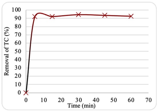 To discover the impact of contact duration on the adsorption removal of TC, batch experiments were performed with contact times ranging from 0 to 60 min. The removal efficiency of TC onto the prepared nanosorbent as a function of contact time is illustrated in Figure 6. The adsorption is a multistep process, with quick removal in the first 5 min and relatively gradual adsorption from 10 to 60 min. At 30 min, the TC removal rate reached equilibrium with a maximum removal of 95%. The results may be explained by the large quantity of vacant active sites and the appropriate pore size of the nanosorbent surface, which facilitate internal mass transfer and the progress of the adsorption process [17]. Nevertheless, due to the accumulation of TC molecules on the nanosorbent surface and an increase in internal diffusion resistance, the adsorption rate gradually decreased after 30 min. Overall, the findings suggest that the produced nanosorbent has a preference for adsorbing TC molecules and are in good agreement with previous results [15].