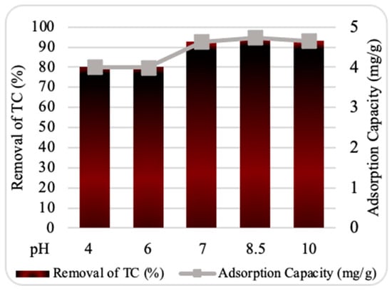 Numerous studies have emphasized the substantial impact of solution pH on TC adsorption in aqueous media [14,16,18]. Determining the optimal pH is crucial for evaluating the interactions between a nanosorbent and TC ions about adsorption efficiency. Different pH levels may influence the surface charge of the nanosorbent, the distribution of TC species, and the degree of dissociation of functional groups on the active sites of TC ions.