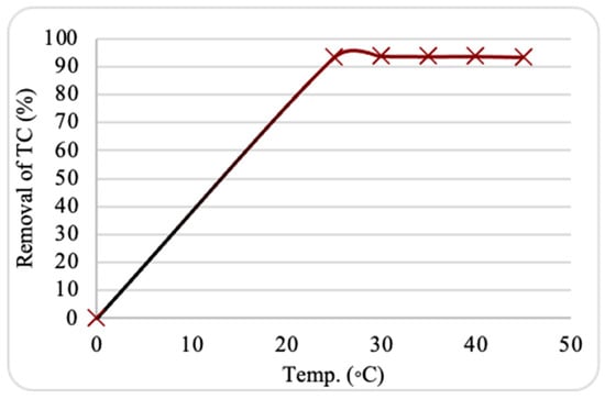 The effects of temperature on adsorption were examined over a range of 25–55 °C to assess the effectiveness of ZnO NPs further. Figure 8 shows that the maximum TC adsorption onto ZnO NPs occurred at 25 °C, with a removal of 95%. Adsorption efficiency reduced significantly as the temperature increased. This trend may be attributed to damage to some active sites due to the temperature rise, reducing the nanosorbent’s ability to bind with TC molecules. The solubility and mobility of TC may also reduce at high temperatures, causing reduced adsorption efficiency.
