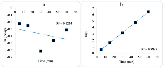 Kinetic plots of (a) pseudo-1st order and (b) pseudo-2nd order for tetracycline adsorption onto ZnO NPs.