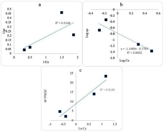 Isotherm plots of (a) Langmuir isotherm, (b) Freundlich isotherm, and (c) Temkin isotherm of tetracycline adsorption onto ZnO NPs.