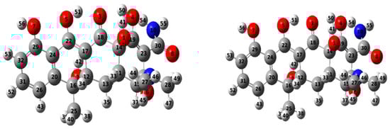 The Molecular Electrostatic Potential (MEP) map was used to analyze charge distribution and photophysical properties, helping to identify regions susceptible to nucleophilic and electrophilic attacks [24]. Figure 13 shows MEP charts for TC and zinc oxide, with red indicating electron-rich sites (susceptible to electrophilic attack) and blue representing electron-poor sites (prone to nucleophilic attack) [25,26].