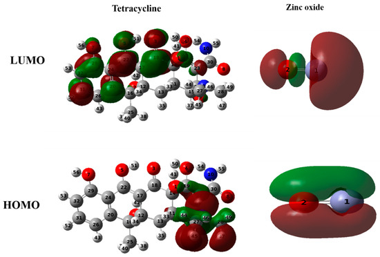 Frontier molecular orbitals of tetracycline and zinc oxide.