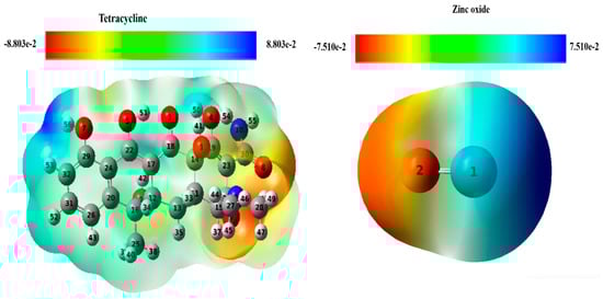 Molecular electrostatic potential maps for tetracycline and zinc oxide.