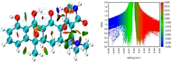 The blue regions correspond to hydrogen bonding. The strong attraction of these bonds leads to a decrease in electron density λ2(ρ), while repulsion results in an increase in λ2(ρ). RDG analysis, as developed by Johnson et al. [27], was employed to evaluate the type of NCIs present in TC. This analysis uses the sign of λ2 and a set of colors to indicate the nature and strength of the NCIs: sign(λ2)ρ < 0 indicates hydrogen bonding (blue), sign(λ2)ρ close to zero signifies van der Waals interactions (green), and sign(λ2)ρ > 0 suggests steric effects (red) [28].