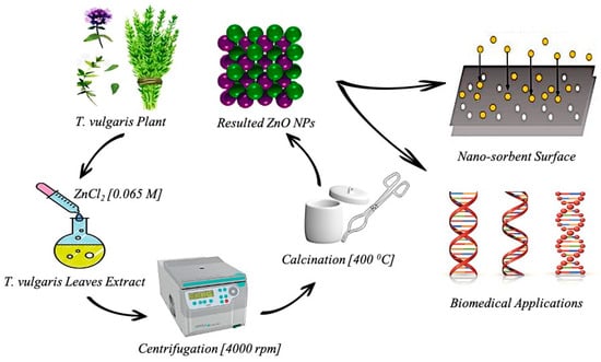ZnO NPs were prepared in a round-bottom flask, by adding 5 mL of ZnCl4 (0.065 M) dropwise to 5 mL of T. vulgaris leaf extract while stirring (250 rpm) and heating to 90 °C. The pH was adjusted to 12 using NaOH (0.1 M) and HCl (0.1 M). The mixture was allowed to settle, then washed several times with hot D.H2O while stirring for 3 min. It was then centrifuged for 20 min at 4000 rpm and washed again with D.H2O and EtOH (1:1). The resulting ZnO NPs were calcined at 400 °C for 3 h, ground to powder, and stored for subsequent experiments (Figure 15).