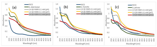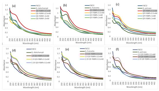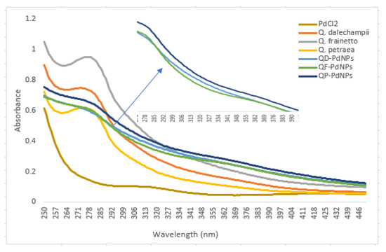 13]. After the biosynthesis of palladium nanoparticles, the remaining TPC in the PdNPs solutions decreased significantly, reaching 50.65 mg/mL for QD-PdNPs, 44.37 mg/mL for QF-PdNPs, and 30.38 mg/mL for QP-PdNPs (