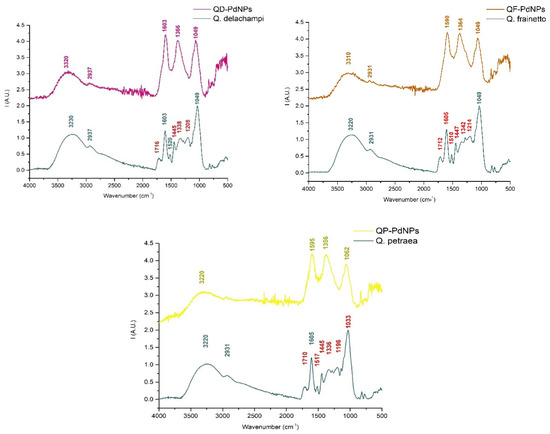 Quercus petraea generate nanoparticles with comparable organic layers, influencing their stability and final size. In contrast, QF-PdNPs (48.0 ± 6.2 nm) show smaller dimensions, indicating that the