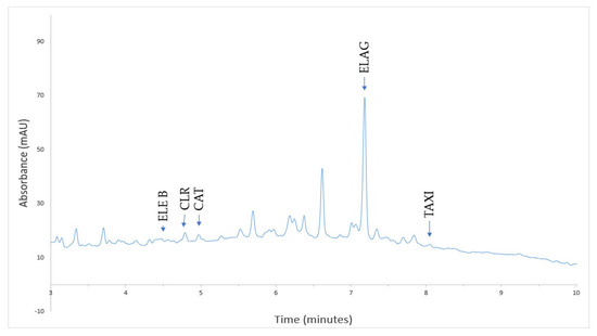 Chromatographic separation was carried out on a Luna C18 (2) column (3 µm, 150 mm × 4.6 mm) with a flow rate of 1 mL/min. The elution gradient included two phases: phase A (0.1% formic acid) and phase B (acetonitrile), following a specific program to vary the concentration of the mobile phases. Analysis was conducted at 280 nm, using reference standards such as gallic acid, eleutheroside B, chlorogenic acid, catechin, epicatechin, luteolin-3′,7-di-O-glucoside, caffeic acid, vanillic acid, luteolin-7-O-glucoside, ellagic acid, sinapic acid, taxifolin, and quercetin. Each standard solution was prepared at a concentration of 20 µg/mL, and 20 µL of each standard was injected to ensure accurate identification of the phenolic compounds in the samples.