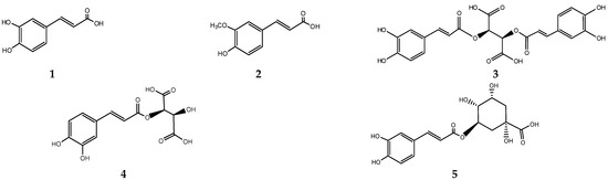 Biologically active substances in the studied extracts—caffeic acid—1, caffeic acid derivatives (ferulic acid—2, chicoric—3, cafratic—4, chlorogenic—5, neochlorogenic—6 acids, cynarin—7, echinacoside—8), flavonoids (apigenin—9, quercetin—10, myricetin—11, epicatechin—12, scutellarin—13, rutin—14), and lignan-arctigenin—15.