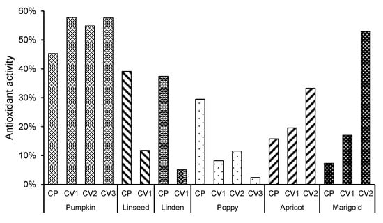 Antioxidant activity was assessed using the DPPH assay, which measures the ability of the unsaponifiable matter to scavenge free radicals. Results are expressed as a percentage of free radical scavenging capacity, where a higher percentage indicates stronger antioxidant activity. The results showed a high variability in the antioxidant activity of the unsaponifiable matter studied (Figure 1). The most noteworthy was the antioxidant activity of all pumpkin seed oil samples (antioxidant activity of between 39% and 50%) and the C-V2 fraction of marigold seed oil (57%). In pumpkin, apricot, and marigold seed oils, the antioxidant activity was higher in SFE-CO2-extracted samples, while, interestingly, the antioxidant activity of linseed, linden, and poppy unsaponifiable matter was higher in cold-pressed oil. A correlation analysis was performed between the composition of unsaponifiable compounds and antioxidant activity, which showed statistically significant correlations (p = 0.05) with squalene (0.677), cycloartenol (0.622), and an unidentified compound (m/z: 343 (100), 75 (57), 55 (52), 73 (46)) at 41.39 min (0.510). Samples with higher concentrations of these three components showed higher antioxidant activity.