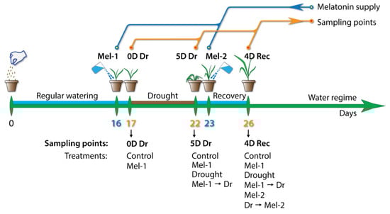 - Katerova, Z.; Todorova, D.; Vaseva, I.I.; Shopova, E.; Petrakova, M.; Iliev, M.; Sergiev, I. Effects of Melatonin Pre- and Post-Drought Treatment on Oxidative Stress Markers and Expression of Proline-Related Transcripts in Young Wheat Plants. Int. J. Mol. Sci. 2024, 25, 12127. [Google Scholar] [CrossRef]