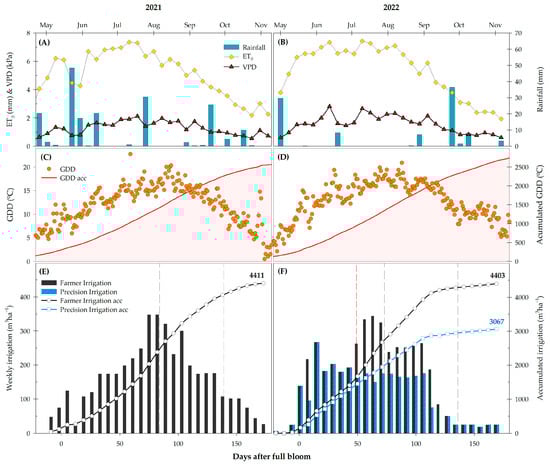 Weekly evolution of the climatic parameters: Vapor pressure deficit (VDP), reference crop evapotranspiration (ET0), and rainfall (A,B). Daily growing degree days (GDDs) and accumulated GDDs from sprouting (−62 DAFBs) (C,D). Weekly and accumulated irrigation applied for each season 2021 (E) and 2022 (F). DAFBs: days after full bloom. 0 DAFBs corresponds to 14 May 2021 and 17 May 2022, respectively, for each season. The gray dashed lines indicate the harvest period, and the red dashed line in 2022 indicates the beginning of the irrigation reduction in PI with respect to farmer irrigation.