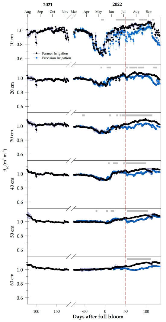 The application of the deficit irrigation in PI, starting on 49 DAFBs 2022, showed significant differences between both irrigation programs at all depths. The most sensitive profile for assessing the different irrigation regimens was at a depth of 30 cm, where the differences were shown during the entire period (Figure 2).