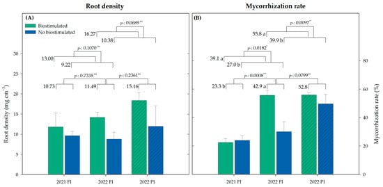(A) Root density and (B) mycorrhization rate for biostimulated (T1–T4) and not biostimulated (T5) vines under the different irrigation programs (farmer irrigation (FI) or precision irrigation (PI)) in 2021 and 2022. Bars represent means ± SE (n = 4). Different letters indicate significant differences for the factors biostimulation, year, or irrigation in each parameter according to Duncan’s test (p < 0.05). Average value for each factor is shown. *: p < 0.05; **: p < 0.01; ***: p < 0.001; ns: not significant.
