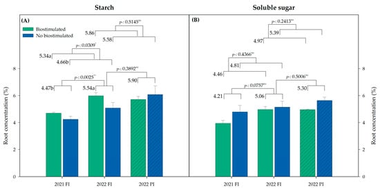 The starch and soluble sugars concentration in the vine roots did not show significant differences between treatments. Starch content was increased in 2022 in all treatments, particularly in those treated with biostimulants (T1–T4), reaching nearly 6% (p/p), and was significantly higher than the nonbiostimulated treatment under FI (Figure 4A). Soluble sugars were unaffected by the year, biostimulation, or irrigation treatments (Figure 4B).