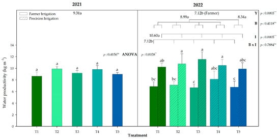 Regarding the yield obtained, the irrigation water productivity (WPI) did not differ between treatments within the same irrigation program (Figure 5), averaging 9.31 kg m−3 in 2021. In 2022, as the yield decreased but the irrigation water did not, the water productivity also decreased to 7.12 kg m−3. Nevertheless, in 2022, the irrigation factor showed significant differences, increasing the WPI by 3.5 kg per m3 in the PI treatments, as the water was reduced with respect to FI. In 2022, the treatments showed significant differences (p < 0.01), with T3 under PI having the highest WPI, whereas the T3 and T5 under FI had the lowest. It must be highlighted that the WPI in T4 was not affected by the irrigation program, as it showed the highest values for farmer irrigation in 2022.