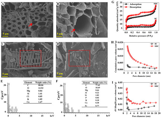 The surface characteristics of biochar samples. (A,C): Scanning electron microscopy (SEM) images of BC (primitive biochar); (B,D): SEM images of HBC (HNO3-modified biochar); (E,F): EDS of BC and HBC; (G): N2 isotherm adsorption–desorption curves; (H): cumulative pore volume of different sizes; (I): pore size distribution. The red arrow indicates the pore size in the biochar; The red box represents the surface damage of biochar.