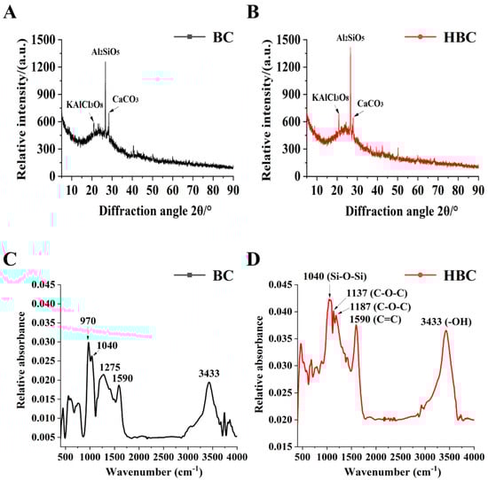 The FTIR spectra of BC and HBC exhibited similar characteristic peaks at 3433 cm−1 (-OH), 1590 cm−1 (C=C), and 1040 cm−1 (Si-O-Si), with higher intensities in HBC. Notably, HBC shows additional peaks at 1137 cm−1 and 1187 cm−1, corresponding to C-O-C vibration (Figure 2C,D).