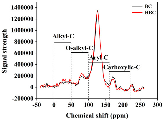 Compared with the original biochar, the peaks of the spectrum of biochar modified with nitric acid show significant differences between the aliphatic carbon region at 0–100 ppm and the carboxyl carbon region at 160–220 ppm (Figure 3). Specifically, compared to BC, HBC decreased the signals of the CH3, O-CH3, C-C, and C-H groups, whilst increasing the signals of the C-O, C-N, and COO groups (Table 2).