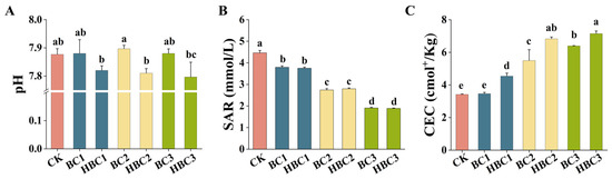 The effects of different addition ratios of BC and HBC on the pH (A), SAR (B), and CEC (C) of salinized soil. Plants treated without biochar (CK); plants treated with 1% BC (BC1); plants treated with 2% BC (BC2); plants treated with 3% BC (BC3); plants treated with 1% HBC (HBC1); plants treated with 2% HBC (HBC2); plants treated with 3% HBC (HBC3). Different letters (a–e) represent significant differences at a 95% probability level.