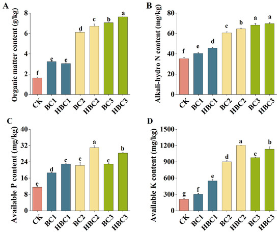The effects of different addition ratios of BC and HBC on the physico-chemical properties in salinized soil. (A): organic matter content; (B): alkali-hydro N content; (C): available P content; (D): available K content. Different letters (a–g) represent significant differences at a 95% probability level.
