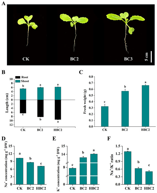 The effects of BC and HBC on the growth potential and ion content of pakchoi seedlings. (A): the growing tendency of seedlings; (B): root length and shoot height; (C): fresh weight of whole seedlings; (D): the content of Na+ in leaves; (E): the content of K+ in leaves; (F): the Na+/K+ ratio in leaves. Plants treated without biochar (CK); plants treated with 2% BC (BC2); plants treated with 2% HBC (HBC2). Different letters (a–c) represent significant differences at a 95% probability level.