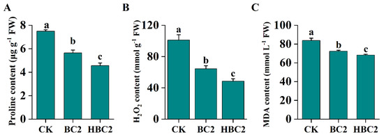 The proline content was drastically inhibited after employing biochar, whether modified or not, and HBC2 exhibited the lowest proline content, decreased by 13.59% (from 83.84 to 72.45 µg g−1 FW) and 18.54% (from 83.84 to 68.30 µg g−1 FW), respectively (Figure 7A). Similarly, compared to the CK, BC2 and HBC2 treatments significantly reduced MDA accumulation, with BC showing a more pronounced effect (Figure 7B).