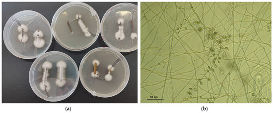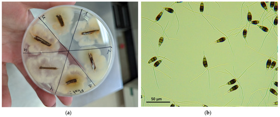 (a) Root incubation on microbiological medium with fungal growth of Neopestalotiopsis spp.; (b) conidia of Neopestalotiopsis spp. obtained from conidiomata formed on the incubation medium.