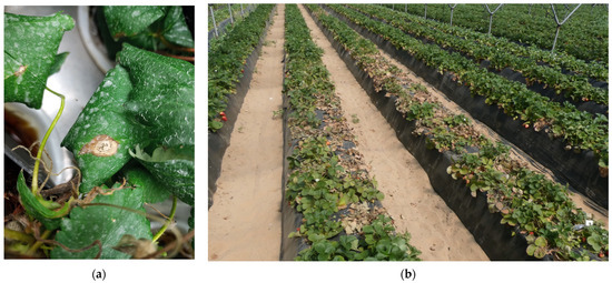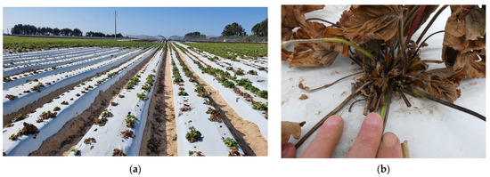 (a) Strawberry plants showing Fusarium wilt disease symptoms (pathotype “yellows-fragariae”); (b) strawberry plant with symptoms of Fusarium wilt showing sporodochia at the base of petioles (pathotype “yellows-fragariae”).
