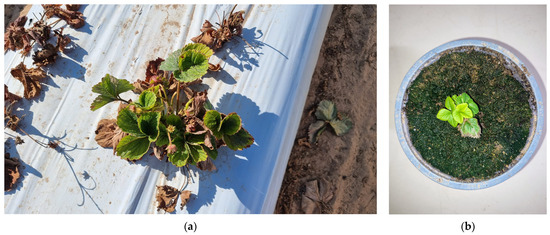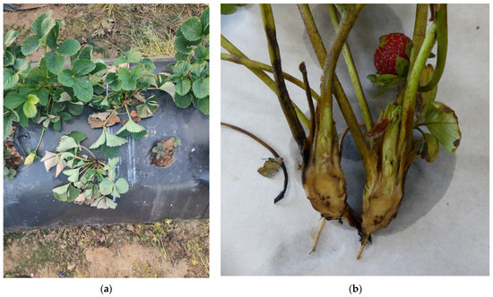 (a) Strawberry plants with root rot caused by Neopestalotiopsis spp.; (b) Strawberry plants with symptoms on crowns caused by Neopestalotiopsis spp.
