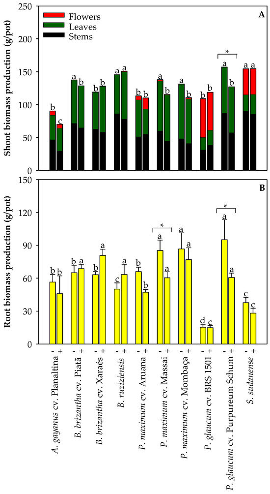 Shoot (A) and root (B) biomass production of grasses cultivated in non-polluted (-) and Cd-polluted (+) Oxisol. Shoot biomass includes stems, leaves, and flowers. Different letters on the bars indicate significant differences between grass species within each Cd pollution condition (Scott–Knott test, p < 0.05), and asterisks (*) indicate significant differences at p < 0.05 between Cd pollution conditions within each grass species (ANOVA, t-test).