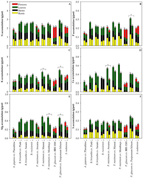 Accumulation of nitrogen—N (A), phosphorus—P (B), potassium—K (C), calcium—Ca (D), magnesium—Mg (E), and sulfur—S (F) in the roots, stems, leaves and flowers of grasses cultivated in non-polluted (-) and Cd-polluted (+) Oxisol. Different letters on the bars indicate significant differences between grass species within each Cd pollution condition (Scott–Knott test, p < 0.05), and asterisks (*) indicate significant differences at p < 0.05 between Cd pollution conditions within each grass species (ANOVA, t-test).